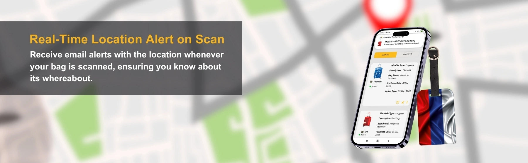 - [Instant Alerts of misplaced bags] Receive real-time email alerts with your bag's location as soon as it is scanned by Finder, so you always know where it is. Also, receive alerts when Lost luggage handlers scan you bag at 2800+ Airports