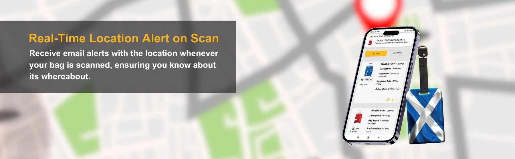 - [Instant Alerts of misplaced bags] Receive real-time email alerts with your bag's location as soon as it is scanned by Finder, so you always know where it is. Also, receive alerts when Lost luggage handlers scan you bag at 2800+ Airports