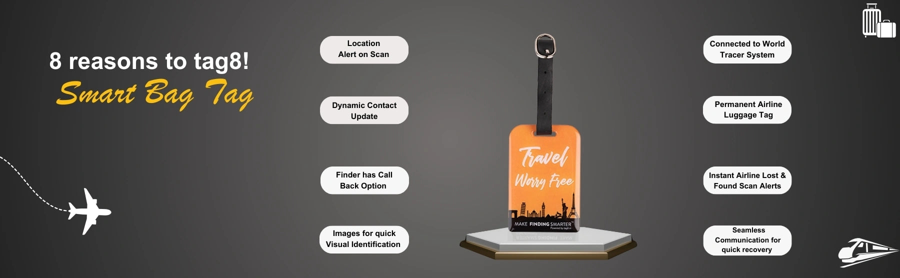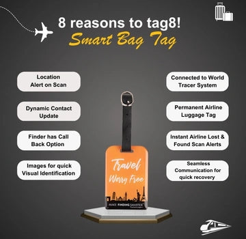 - [Versatile and Smart] Use the tag8 bag tag for both airline travel and everyday local trips. It's much smarter than a traditional name tag, offering advanced tracking and real-time updates for all your journeys