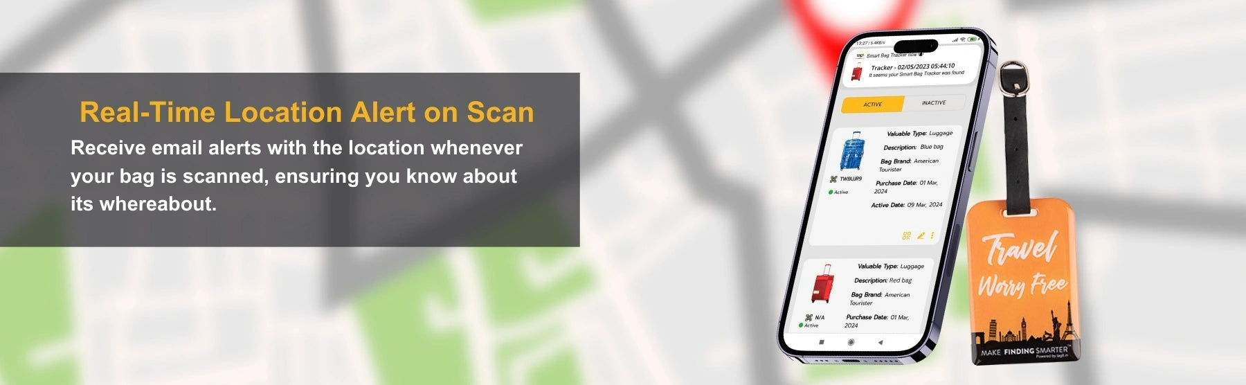 - [Instant Alerts of misplaced bags] Receive real-time email alerts with your bag's location as soon as it is scanned by Finder, so you always know where it is. Also, receive alerts when Lost luggage handlers scan you bag at 2800+ Airports